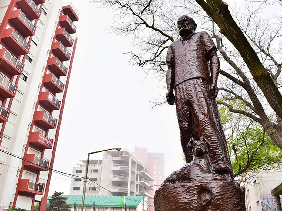 Don Carlos Gesell y su fiel perro, retratado en la escultura del eximio artista Alberto Gervasio, será parte de la 35 edición de la Fiesta de la Diversidad, luego de ser restaurada fue trasladada desde el parque temático hasta avenida 2 y paseo 105.