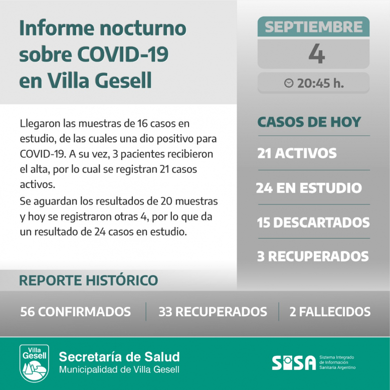 El INE devolvió los resultados de 16 muestras. Una dio positivo mientras que tres pacientes recibieron el alta definitiva. La ciudad continúa con 21 casos activos, controlados y aislados.