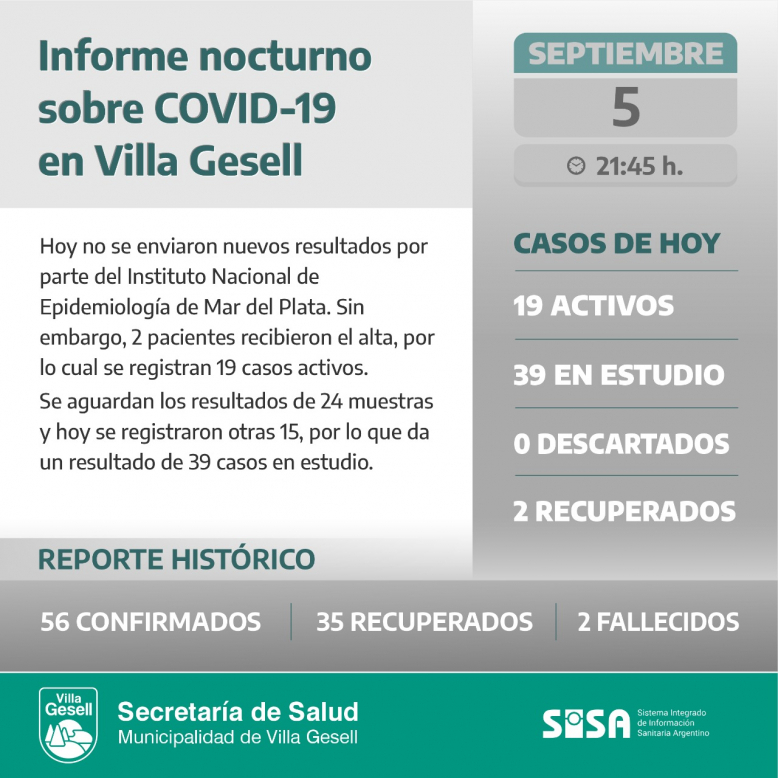 La ciudad registra 19 casos activos y simultáneos. Se aguardan los resultados de 24 muestras y hoy se registraron otras 15, por lo que da un resultado de 39 casos en estudio.
