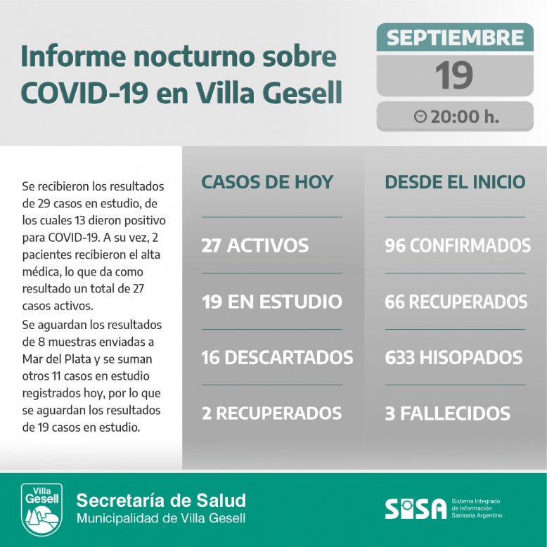 Desde el inicio de la pandemia, Villa Gesell registra 96 casos confirmados por COVID-19, entre los cuales 27 se encuentran activos, 66 pacientes recibieron el alta y 3 fallecieron.