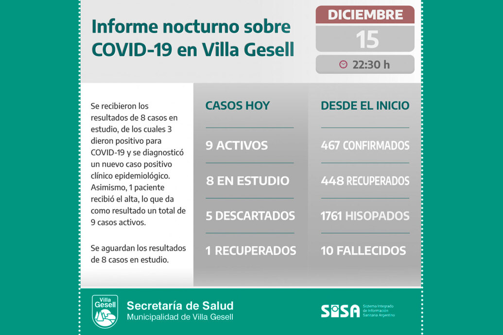 Desde el inicio, Villa Gesell registra un total de 467 casos confirmados por COVID-19, entre los cuales 9 se encuentran activos, 448 pacientes recibieron el alta y 10 fallecieron.