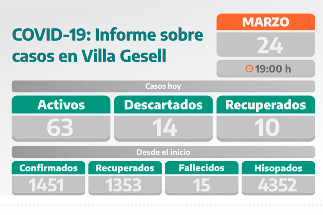 Las cifras de coronavirus positivos continúan estables en Villa Gesell. La comuna informó que la ciudad presenta 63 casos, un registro similar al que se viene dando en los últimos dos días.