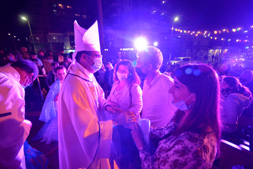 Durante la concurrida celebración en la entrada principal de la parroquia, Monseñor Gabriel Mestre llamó a "dejar en el corazón de María nuestros temores y vivir la alegría de la llegada de Jesús en esta Navidad", recuperando la "revolución de la ternura a la que nos convoca el Papa Francisco".