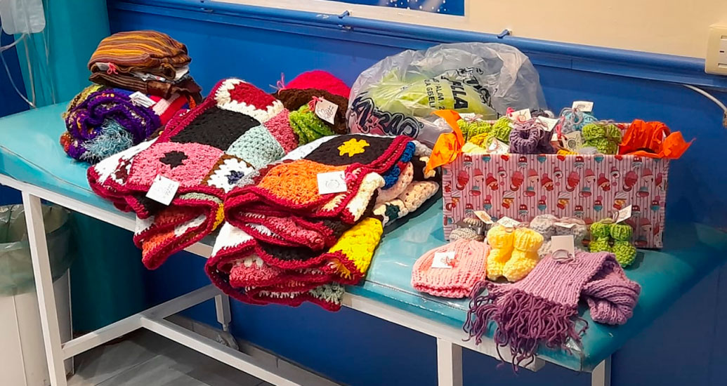Las piezas de abrigo fueron tejidas por quienes asisten al taller coordinado por la psicóloga Gabriela Massa, de la Dirección de Políticas Sociales para la Tercera y Cuarta Edad, a cargo de Daniela D’ Eramo, con lanas donadas por comerciantes y vecinas y vecinos.