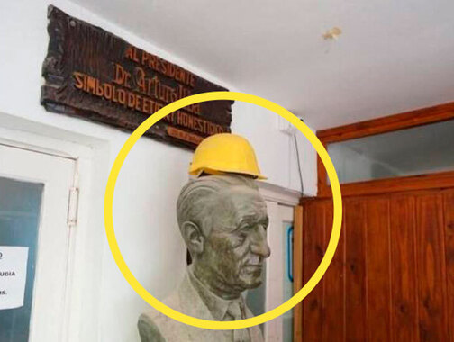 La comuna publicó una foto con tono burlón de la obra del hospital donde se ve el busto de Illia con un casco de obra amarillo. DIFICIL NO VERLO y decir que fue "sin querer".